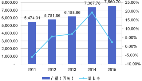 2011-2015 年我國塑料(liào)制品産量及增長(zhang)率情況