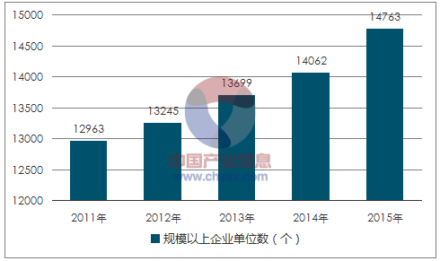 2011-2015 年我國塑料制(zhì)品行業規模以上(shang)企業數量情況